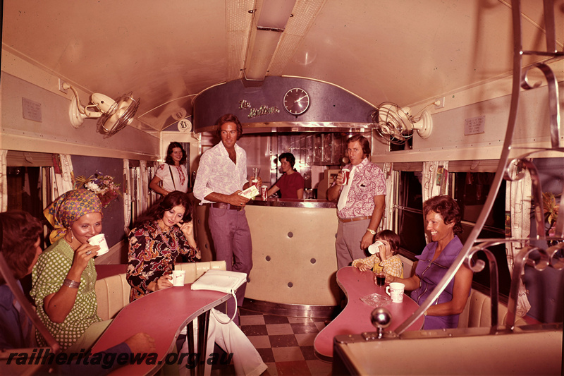 AQL class 290 buffet car, "The Mullewa", staged publicity photo with actors, interior view