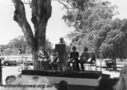 P15993133 viewsRegauging standard gauge track, edge of platform, workers, front end loader, Fiat 500 tractor licence no UQN194 with trailer, water tank, trackside buildings, Goongarrie, KL line