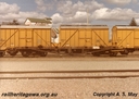 P01245258 viewsRBW class 11269 "Bulk Wheat" wagon with yellow and red tarpaulin, brown livery, at the Dingo Flour Mill, Rocky Bay Line, side view, Leighton .