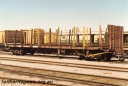 P19392105 viewsQBB class flat wagons with bolsters and stanchions, brown livery, Forrestfield Yard, side and end view