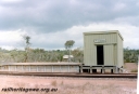 P2304954 viewsShed with station nameboard, end of wheat bin, track, Konnongorring, EM line, track level view