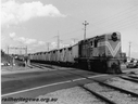 P10315187 viewsY class loco in the Westrail orange livery hauling a train consisting of FD class vans over the Cockburn Road level crossing in Coogee, probably a wool train, signal gantry with searchlight signals in the background