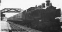 P02480205 viewsDM class 4-6-4- t loco with rake of new AY class carriages in the cream and green livery, footbridge, possibly at Maylands.